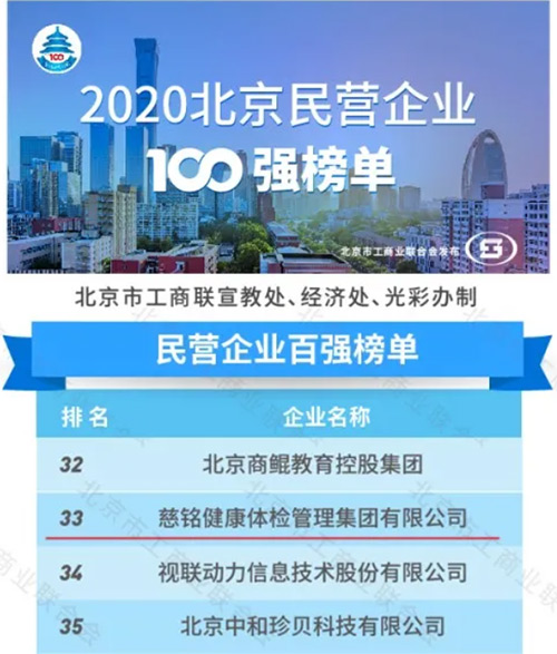 10月10日,由北京市工商聯與北京經濟技術開發(fā)區(qū)管委會聯合舉辦的“2020北京民營企業(yè)百強發(fā)布會”在京順利召開,會上發(fā)布了2020北京民營企業(yè)百強調研分析數據、榜單并授牌。慈銘體檢憑借積極主動履行企業(yè)社會責任、熱心參與公益...